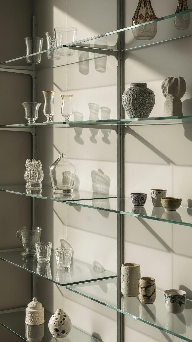 Showcase what matters by arranging collections on open glass shelving where light and sightlines do the work for you. You’ll curate airy vignettes mixing antique glassware with sculptural pieces and miniature ceramics, spacing items for rhythm and negative space.
