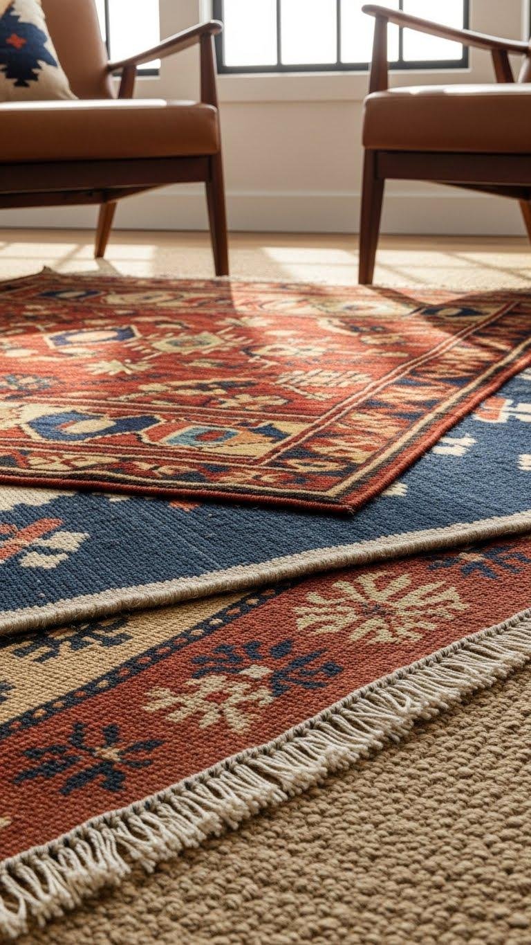 Although it might seem counterintuitive, stacking rugs brings instant pattern, warmth, and scale to a room without overwhelming the eye. You’ll embrace pattern play by layering a bold kilim over a neutral sisal, creating intentional texture contrast and visual rhythm.