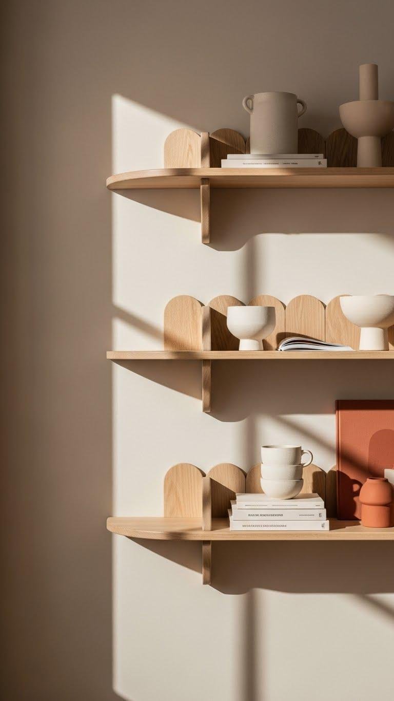 Install scalloped or curved shelving to soften hard lines and give your walls a tailored, designer feel—think gentle arcs that catch light and cast elegant shadows.