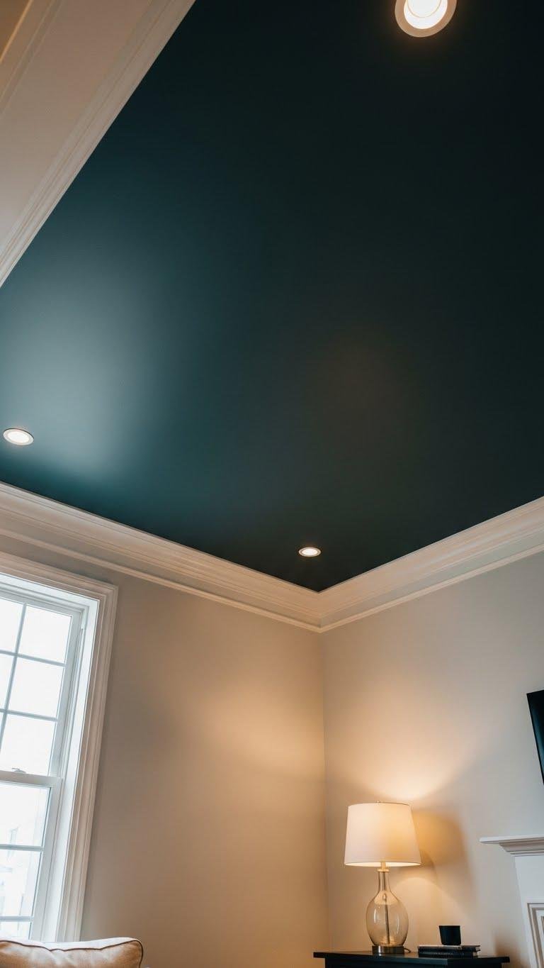 You’ll feel liberated to experiment with jewel tones or charcoal, letting the dark overhead cocoon the space while keeping walls light and airy.