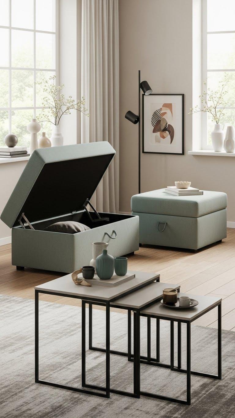 Choose folding ottomans for hidden storage and extra seating, and sleek nesting tables that expand for guests then tuck away.