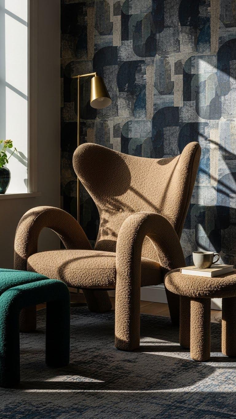 After you’ve anchored a room with a dramatic wallpapered wall, bring in a sculptural statement armchair to add personality and three-dimensional interest—think of it as wearable art for your seating. Choose a chair with a bold curved silhouette, luxe upholstery, and tactile detailing. Pair it with a compact sculptural ottoman to define a liberated reading nook that feels both artful and effortlessly welcoming.
