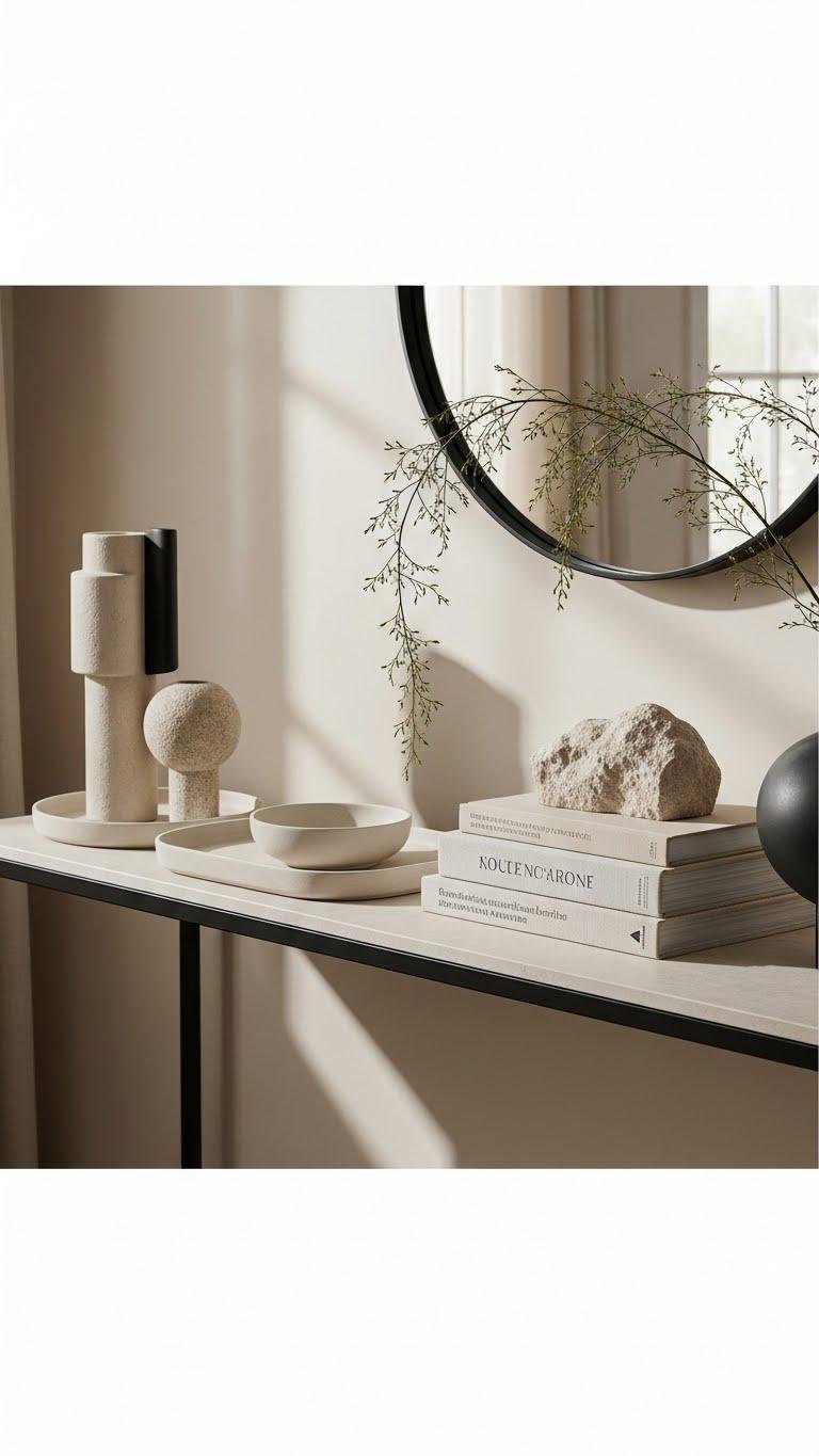 When you curate a console vignette, think of it as composing a small still life that sets the tone for the whole room—mix height, texture, and negative space so each object can breathe and contribute. You’ll pair minimalist trays with sculptural objects, layered curated books, and a statement mirror or art. Edit ruthlessly, keep palettes restrained, and let the arrangement feel effortless and free.
