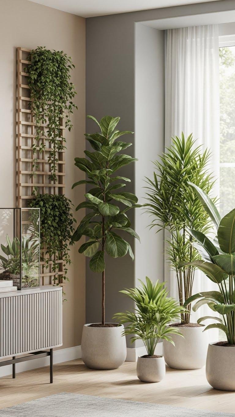 You’ll mix sculptural palms or fiddle-leafs with sleek pots, tall terrariums for drama, and vertical trellises to let climbing greenery feel deliberate and free.