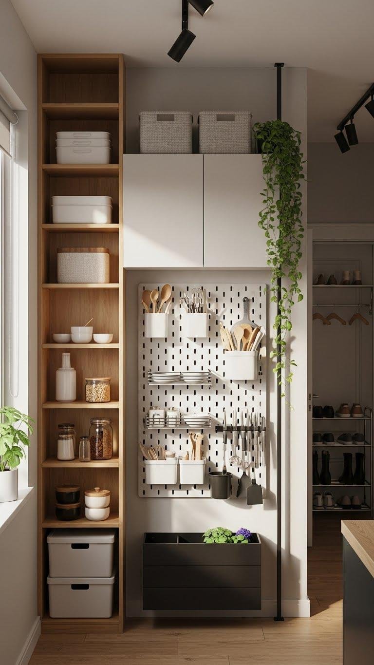 In narrow apartments, think up instead of out: tall shelving, wall-mounted cabinets and slim pegboards free precious floor space while keeping items visible and accessible.