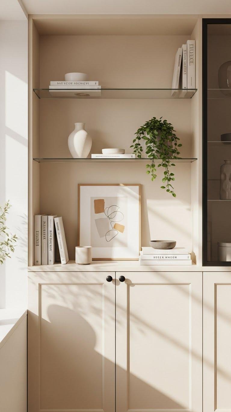 Open or glass shelving can lift a small space visually, but use it with intention so it feels airy rather than cluttered. You’ll display essentials and art sparingly, balancing negative space with a few curated pieces. Choose open shelving for easy access and glass cabinets to protect items without closing the room. Keep palettes simple, align heights, and rotate items to maintain freedom and calm.