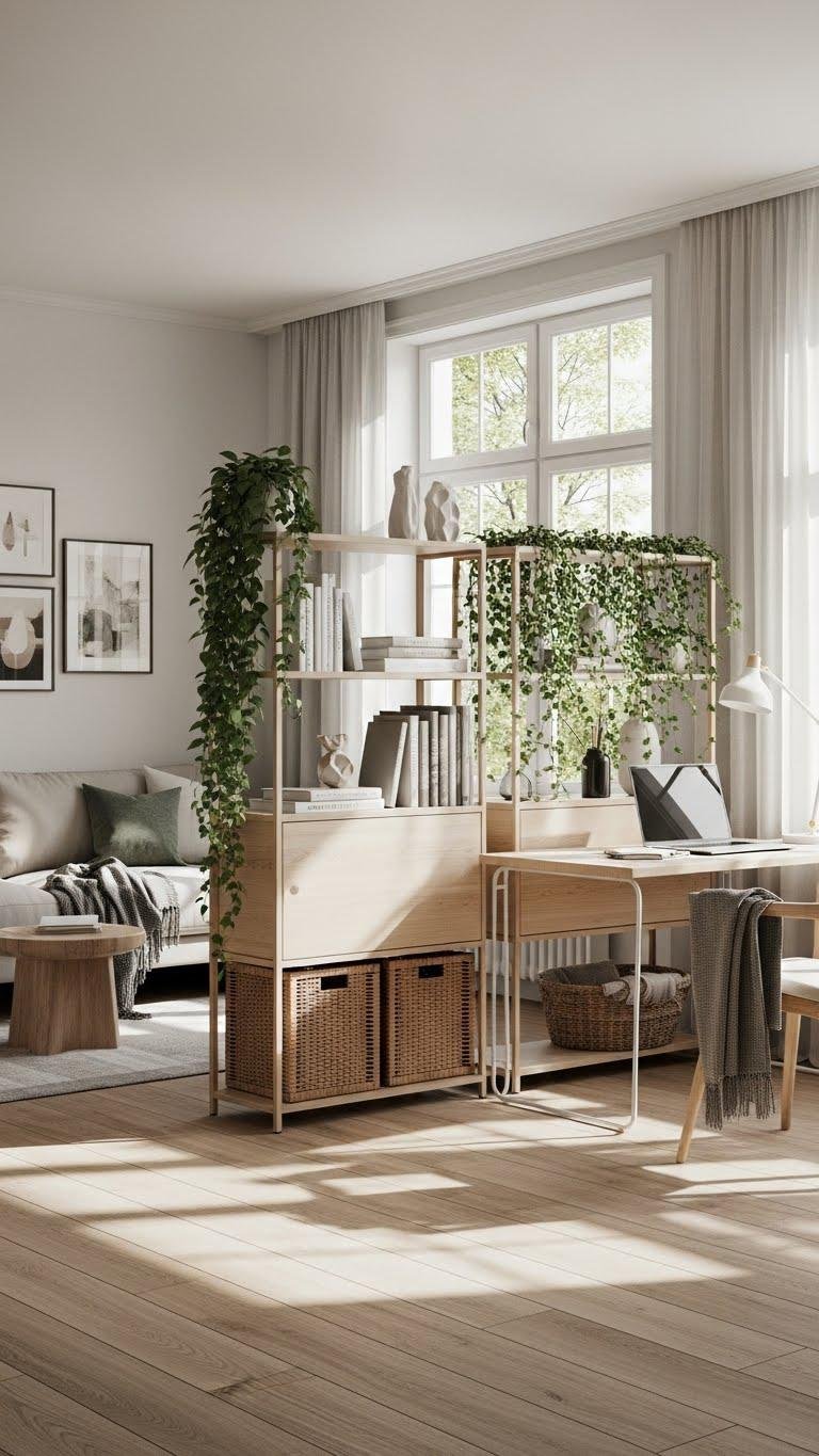 Use open shelving to create shelving privacy that still breathes; display books, baskets, and a plant partition to soften sightlines. You’ll define zones while keeping flow and airiness. Choose slim, modular units so you can move and reconfigure as your life changes.