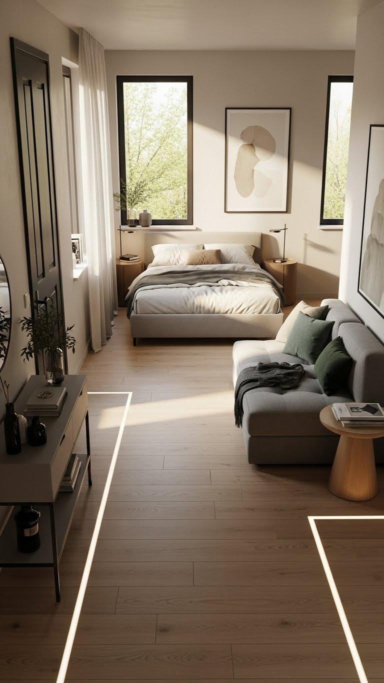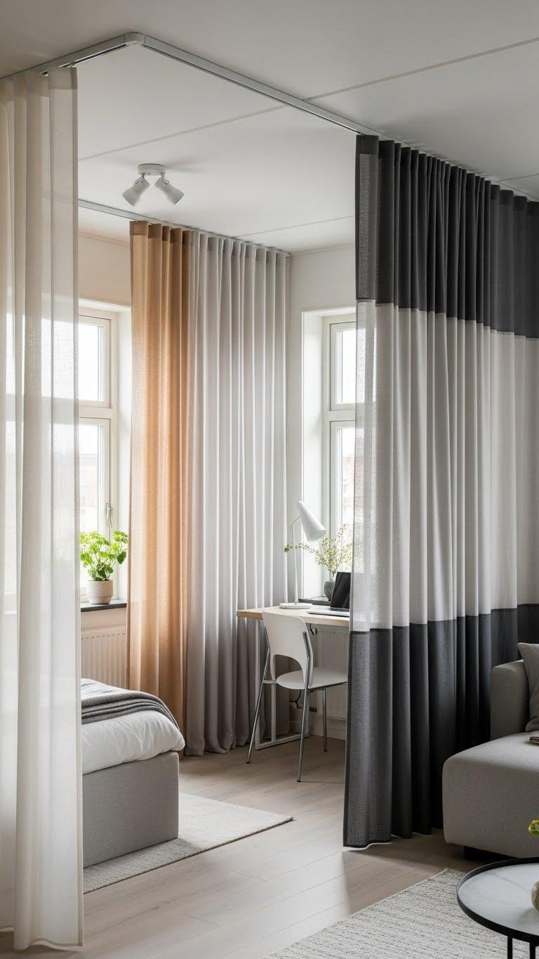 Suspended from ceiling tracks, floor-to-ceiling curtains let you redefine a studio’s layout instantly—pull them closed for privacy, or tuck them back to open the space. Use curtain zoning to create work, sleep, and lounge areas without walls. Choose light fabrics and layered drapery for texture and sound control. You gain adaptable boundaries that feel airy, intentional, and liberating.