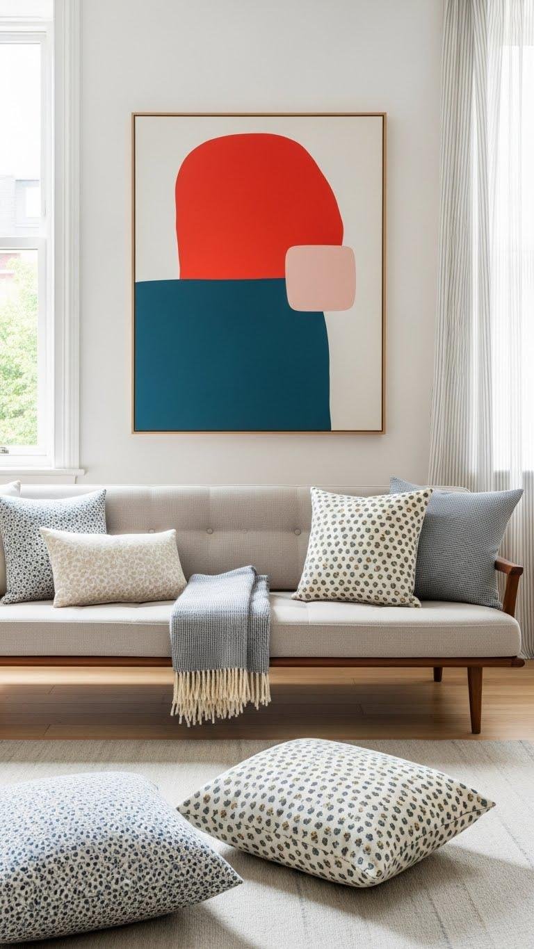 After you’ve committed to one oversized artwork, keep patterns in the rest of the room small to medium so textures and prints don’t compete with that focal piece.