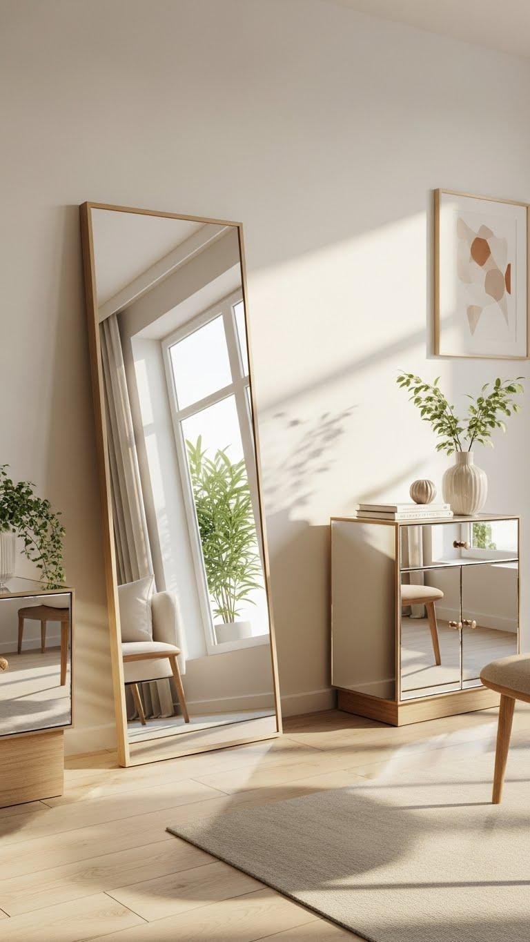 Lean a large mirror for casual freedom or choose mirrored furniture to double reflective surfaces without clutter. You’ll expand sightlines, make rooms feel airy, and keep the layout open and intentional.