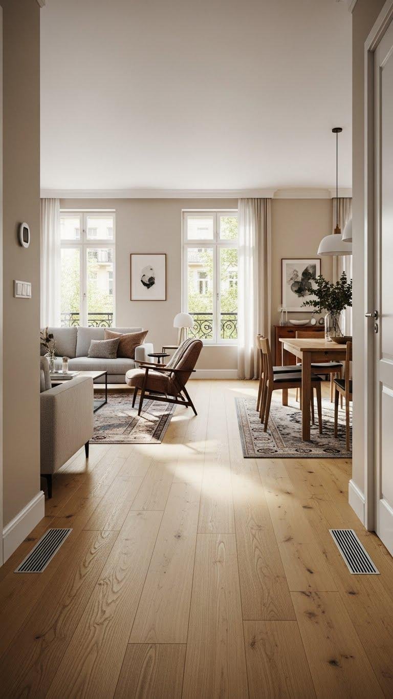 Often you’ll get a stronger sense of space by carrying the same flooring through adjoining rooms—continuous floors visually expand a small apartment, create a seamless flow, and make furniture placement feel intentional rather than segmented. Keep materials consistent, add layered warmth with heated flooring, and define zones with patterned rugs. You’ll preserve openness while expressing personal style and freedom in your layout.