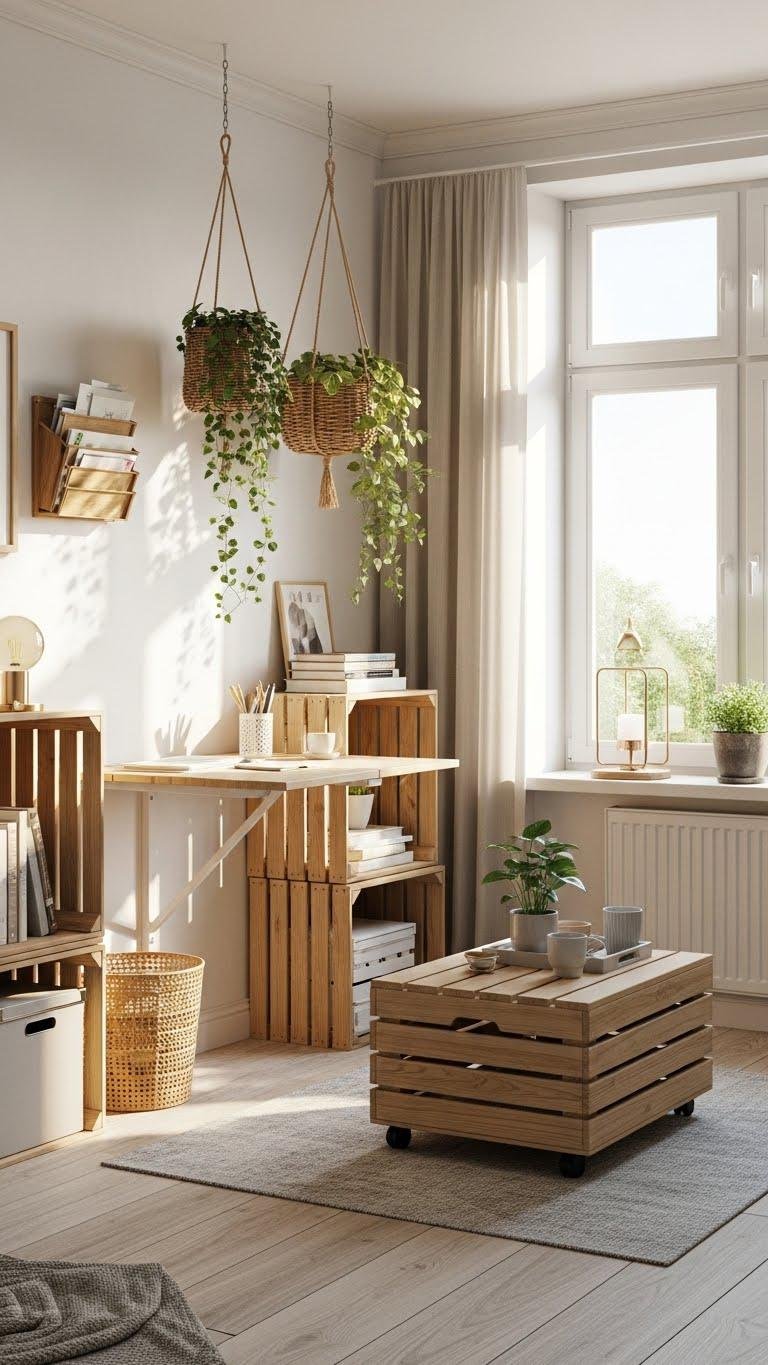 Choose upcycled crates as modular shelving or a rolling coffee table.