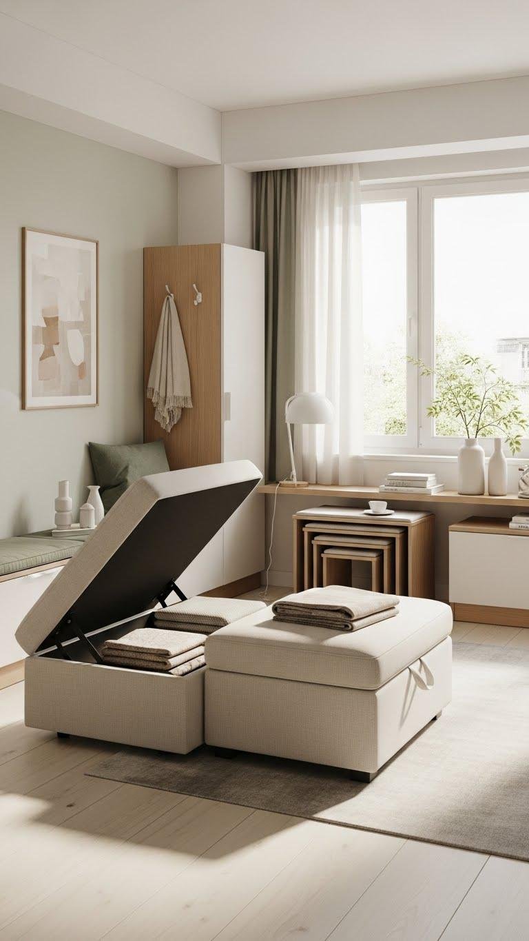 If you need your small apartment to do more with less, choose furniture that multitasks without shouting for attention. You’ll pick pieces that free up space and mind: convertible ottomans that stash blankets and pop open into extra seating, nesting stools you tuck away or spread for guests, and sleek storage benches.