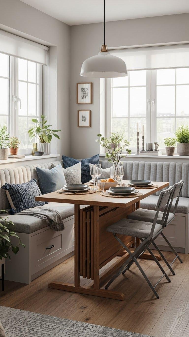 Choose slim benches, storage ottomans and foldable seats that tuck under tables to keep walkways clear.