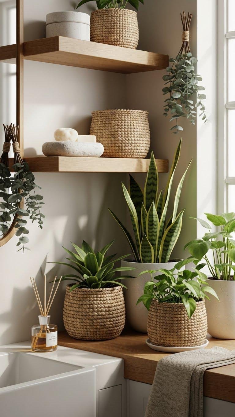 If you want the bathroom to feel calmer and more connected to nature, add biophilic touches that bring texture, scent, and soft movement into the space. Choose natural textures—wood shelves, stone soap dishes, woven baskets—and place low-maintenance indoor plants where light allows. Opt for a simple reed diffuser or eucalyptus bundle for scent. These choices free the room and your mind without clutter.