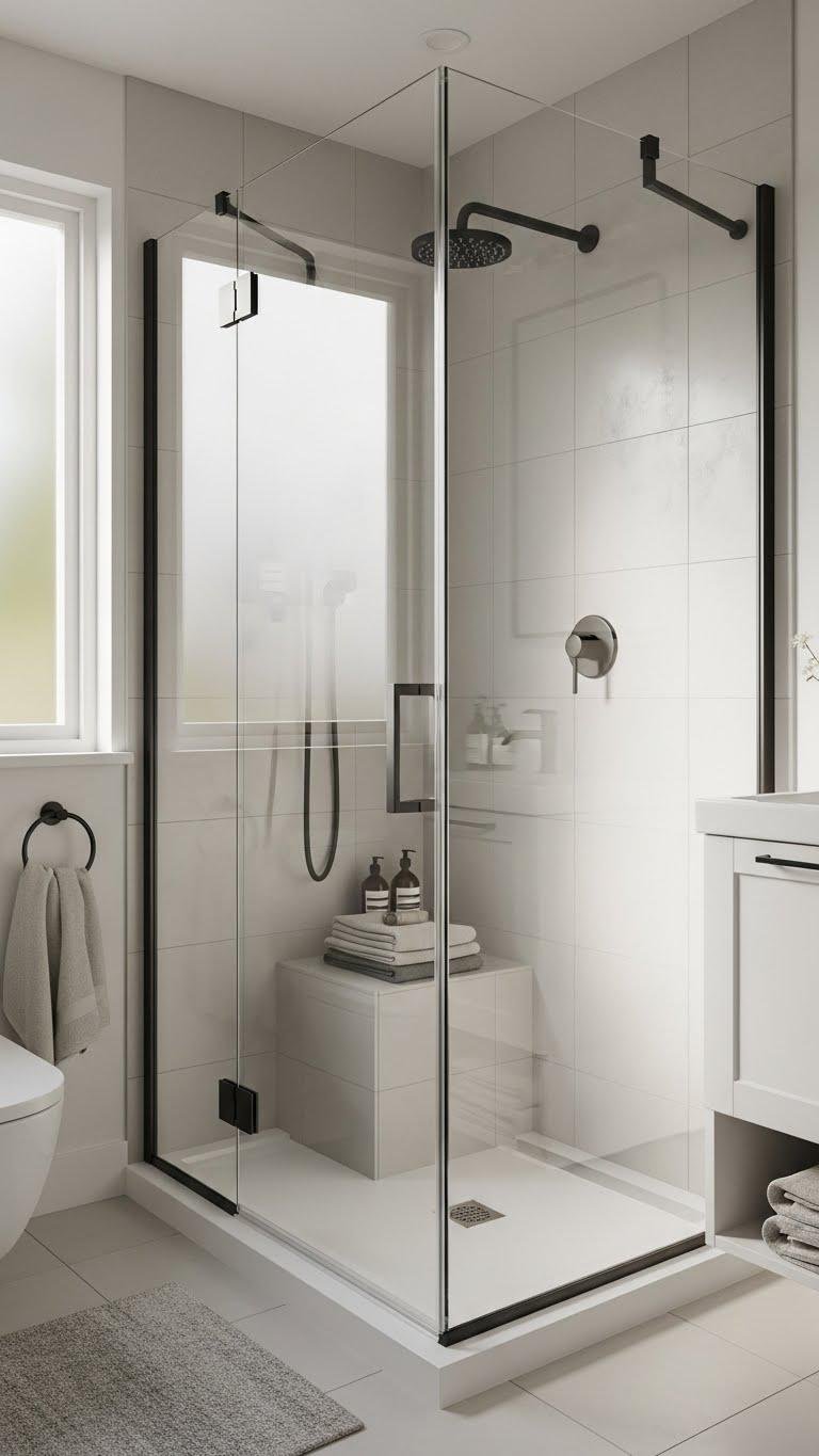 If you want to maximize floor space without sacrificing style, fit a corner or L‑shaped shower to free up room for vanity or storage. You’ll love how angled glass keeps sightlines open while carving usable space.
