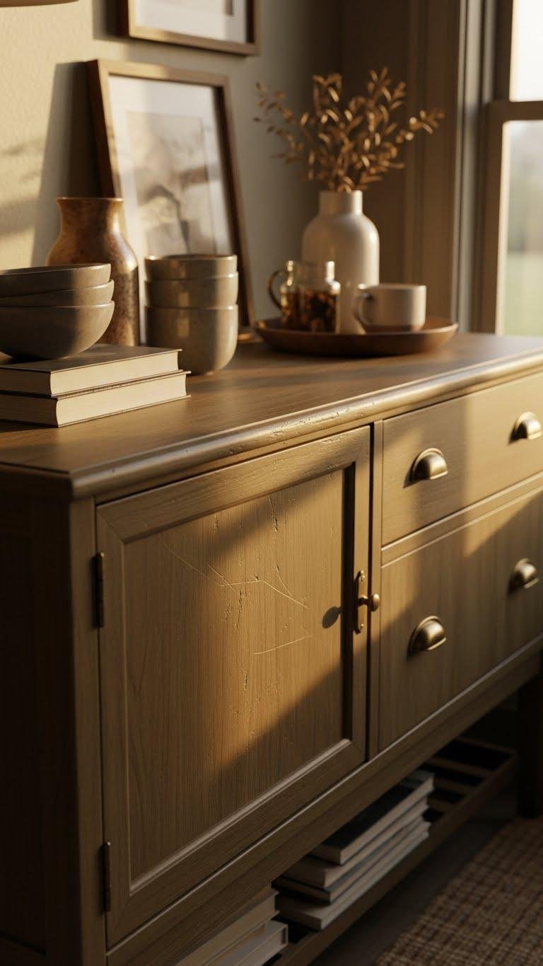 Because a thrifted sideboard carries years of use, it instantly brings history and warmth into your space—its worn finish, brass hardware, and soft patina tell a story that mass-produced pieces can’t match.