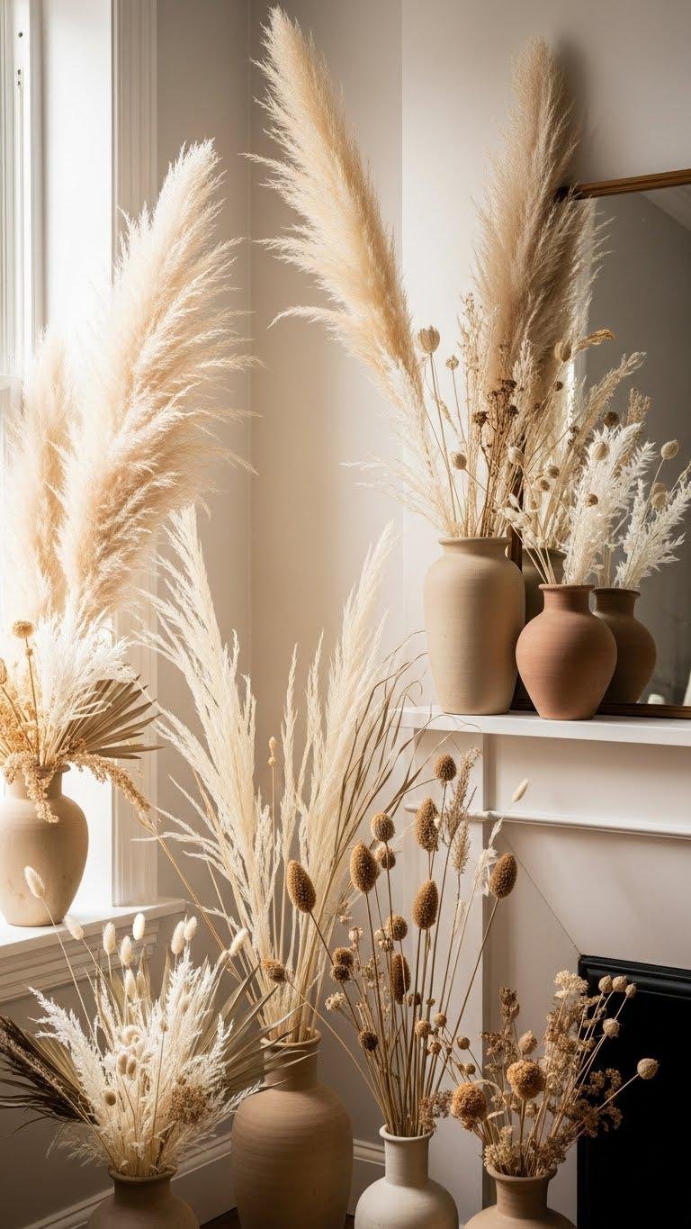 Dried pampas and neutral botanical arrangements bring soft, sculptural movement to a room without demanding color—think feathery plumes, bleached grasses, and preserved seedheads arranged in warm, earthen vases that echo the soft aesthetic.