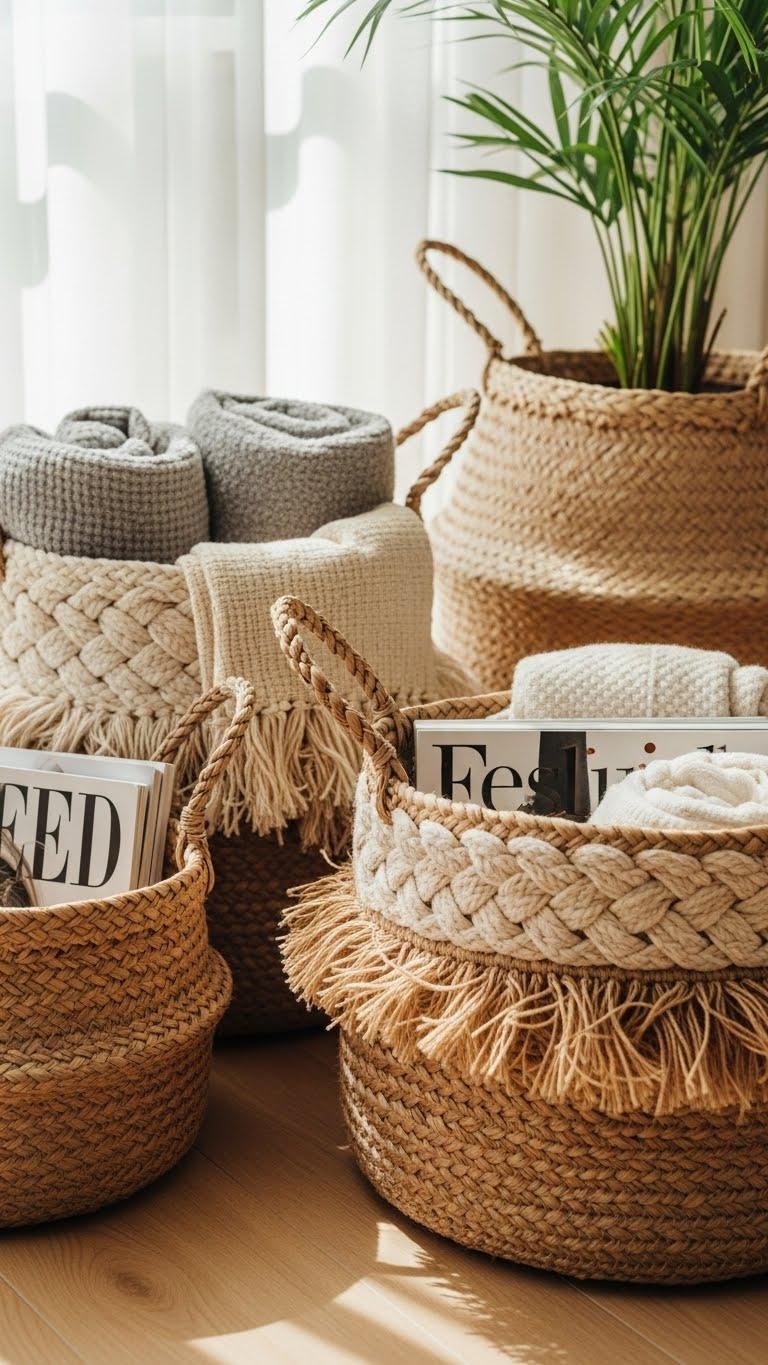 Woven jute baskets add instant tactile warmth and casual structure to a soft aesthetic—think chunky braids, frayed edges, and sun-bleached tones that feel both lived-in and curated.
