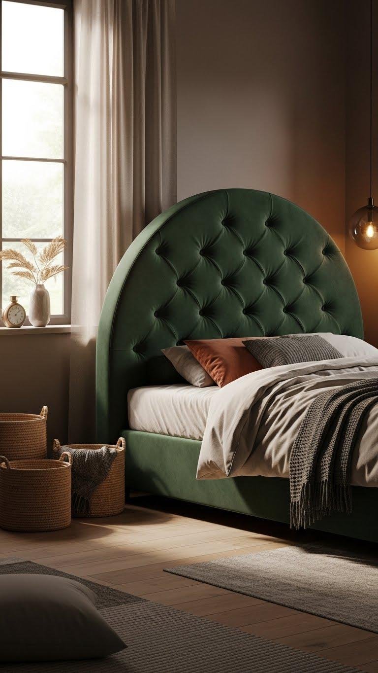 You’ll love how velvet tufting adds subtle luxury while an arched silhouette softens the room. It invites lounging, supports bold color choices, and feels effortlessly free — a modern, expressive focal point for relaxed, intentional bedrooms.