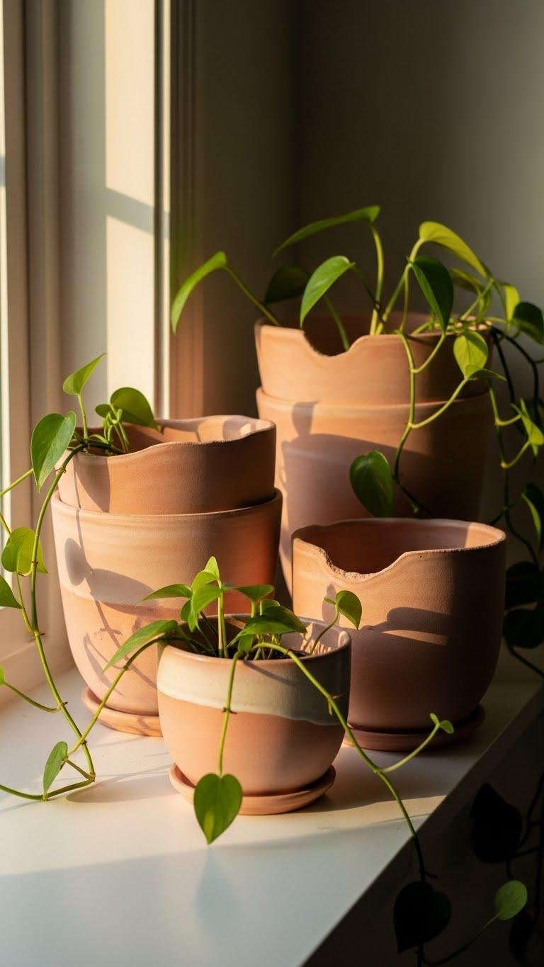 You’ll love mixing matte glaze finishes and varied sizes, leaving some raw edges for character. Choose pots with drainage holes, gather plants that roam, and let each piece breathe — uncluttered, free, intentional.