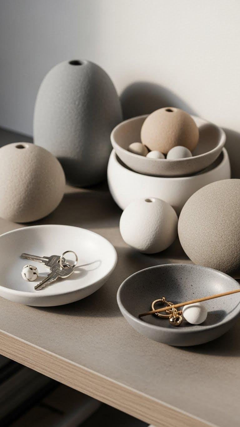 Choose matte ceramic versions that mimic river stones or smooth stoneware pebble bowls for keys, jewelry, or incense. You’ll feel liberated mixing sizes and neutral tones, creating a calm, tactile vignette that reads modern, effortless, and intentionally free.