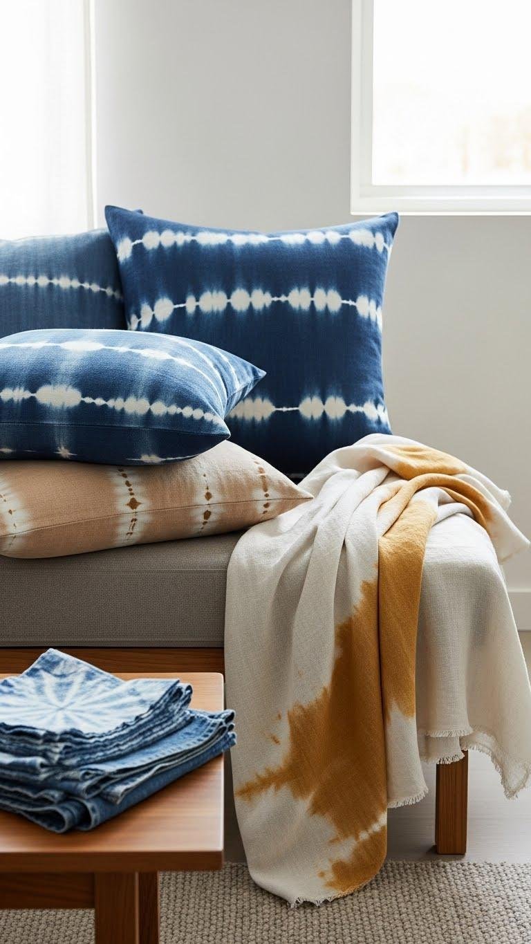 You can keep that calm, edited look while adding quiet pattern and handcrafted texture with subtle shibori and hand-dyed textiles.
