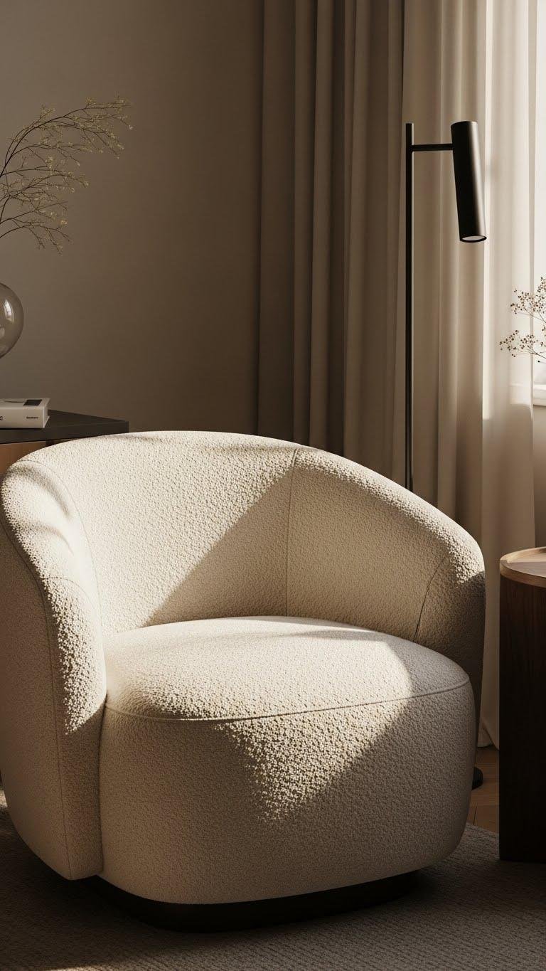 You’ll choose a boucle armchair for its sculptural silhouette and effortless calm, pairing boucle upholstery with matte woods or metal for tactile contrast.