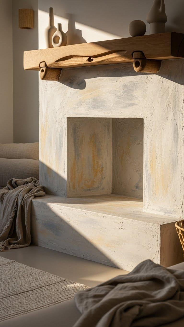 Bring a textured plaster surround into your living space to anchor the room with quiet, artisanal charm. You’ll love how tactile limewash catches light, offering soft, weathered depth without fuss.