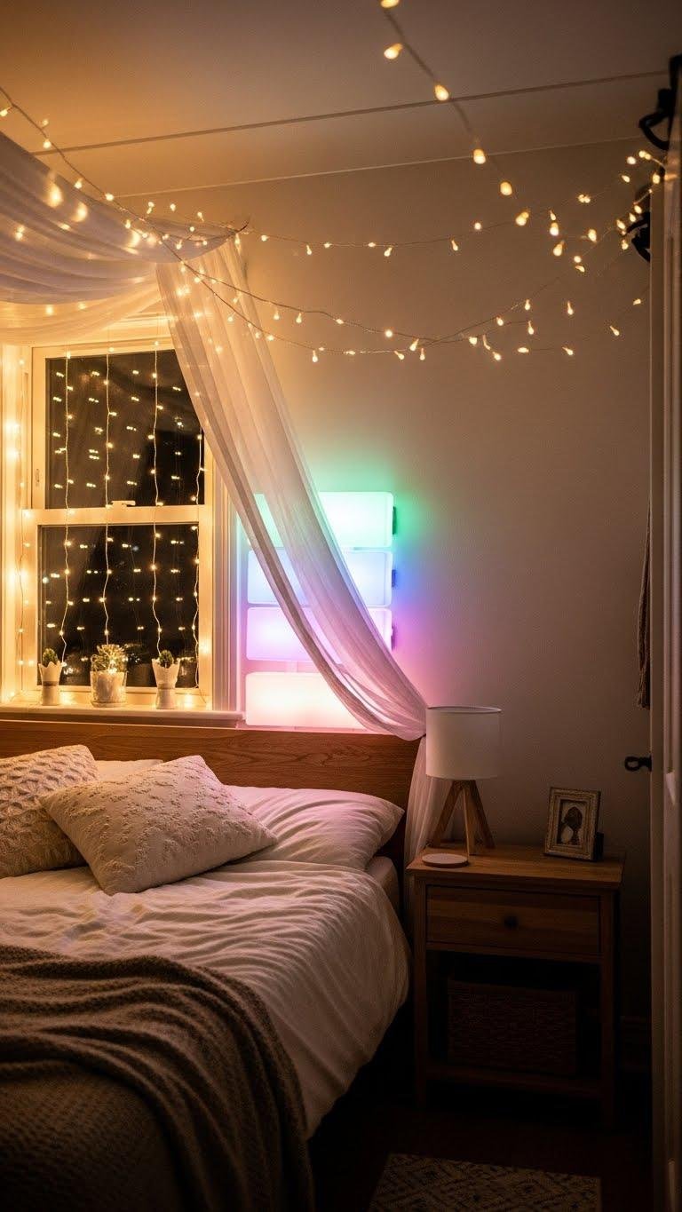 You can drape twinkling canopies over a bed, outline windows, or tuck color changing strips behind furniture for playful control.
