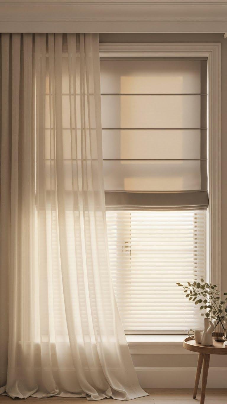 When you pair airy curtains with tailored Roman shades, you get a window treatment that’s both soft and structured—perfect for a soft aesthetic that values texture and calm control. You’ll love how privacy layers blend with light-filtering solar blinds, letting you shift mood and daylight effortlessly. It feels liberating to mix flowing fabric and clean lines for a serene, flexible room vibe.