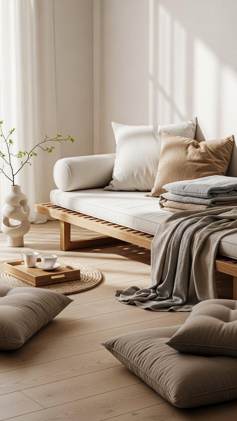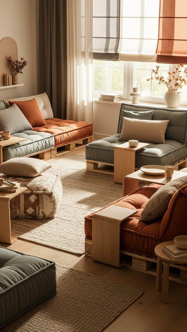 You’ll mix floor cushions and streamlined pallet seating to craft flexible zones, choosing muted textures and movable pieces so you can reshape layouts freely, stay cozy, and keep a calm, curated vibe.