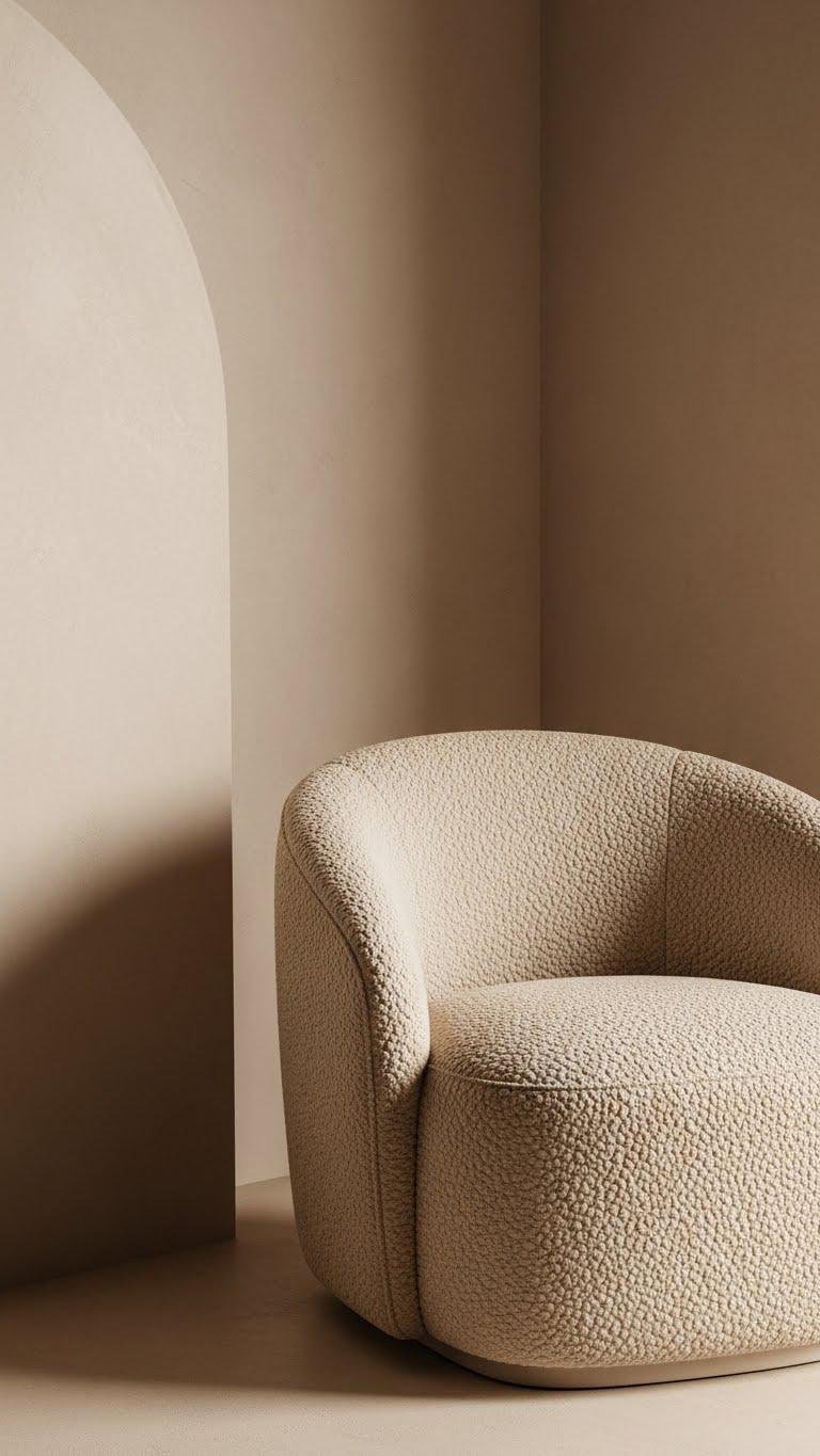 Pairing a rounded bouclé armchair with soft matte plaster walls in warm beige amplifies that cozy, sculptural vibe—your chair reads like a piece of furniture, while the walls feel like a quiet, tactile backdrop. You’ll love how textural paint and matte finish made with earthen pigments invite calm; tactile application leaves soft undulations that celebrate imperfection and let your space breathe freely.