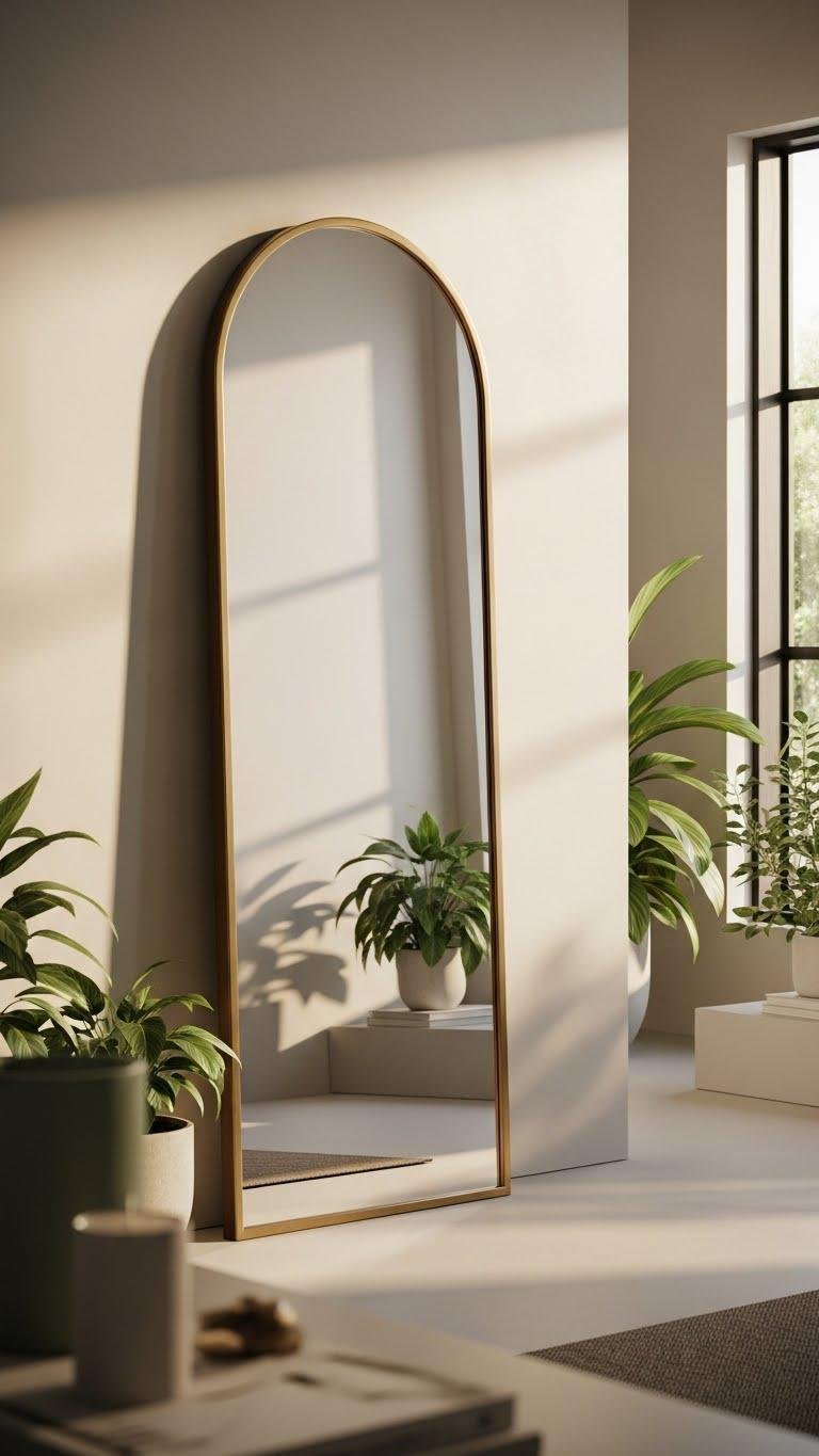 Leaning an arched floor mirror with brushed brass trim against a soft matte wall instantly lifts the room’s sculptural mood and adds a warm, reflective focal point you’ll keep coming back to.