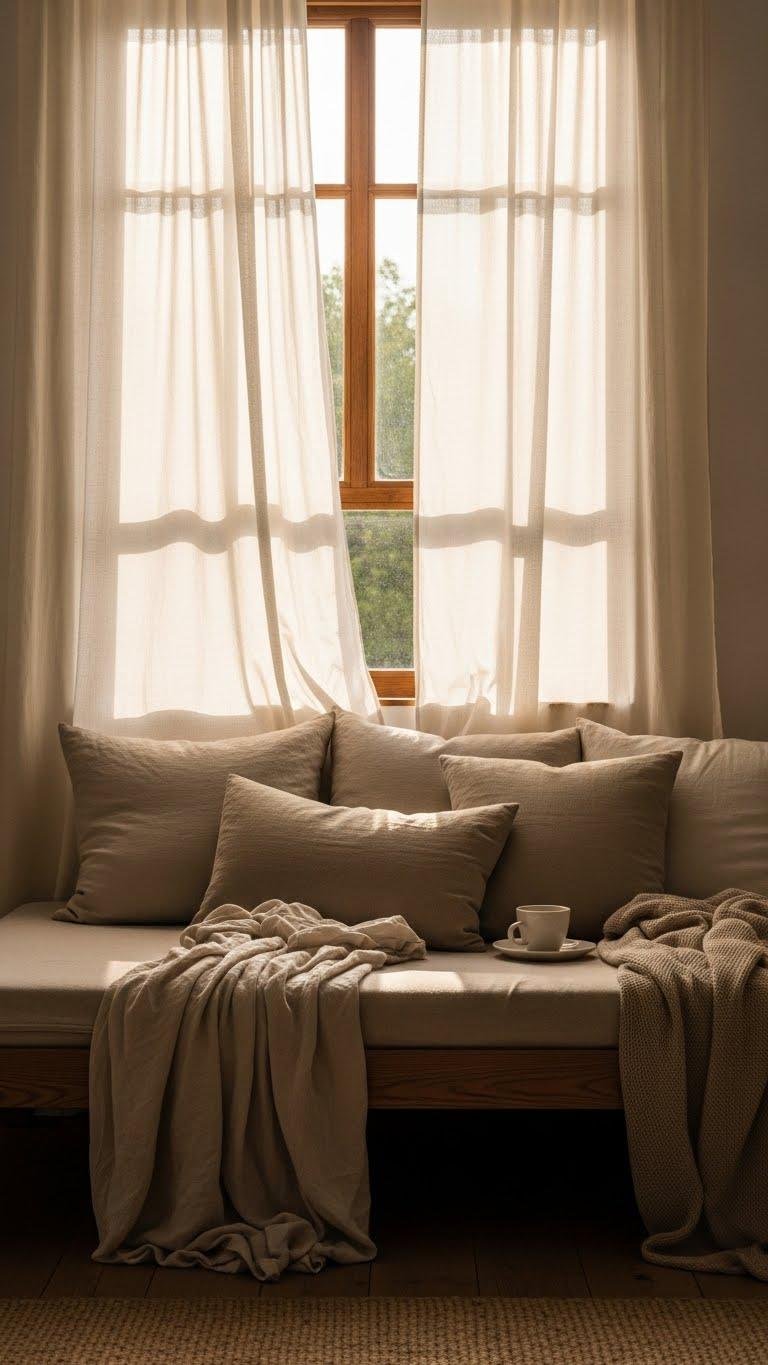 After the low wooden daybed and its layered linens set the mood, softening the light with semi-sheer drapery keeps the room feeling airy while adding warmth and texture. You’ll love how soft filtering through sheer texture creates a forgiving glow, blurring edges and promoting calm. Choose breezy panels in neutral tones to invite movement, privacy, and a liberated, lived-in elegance.