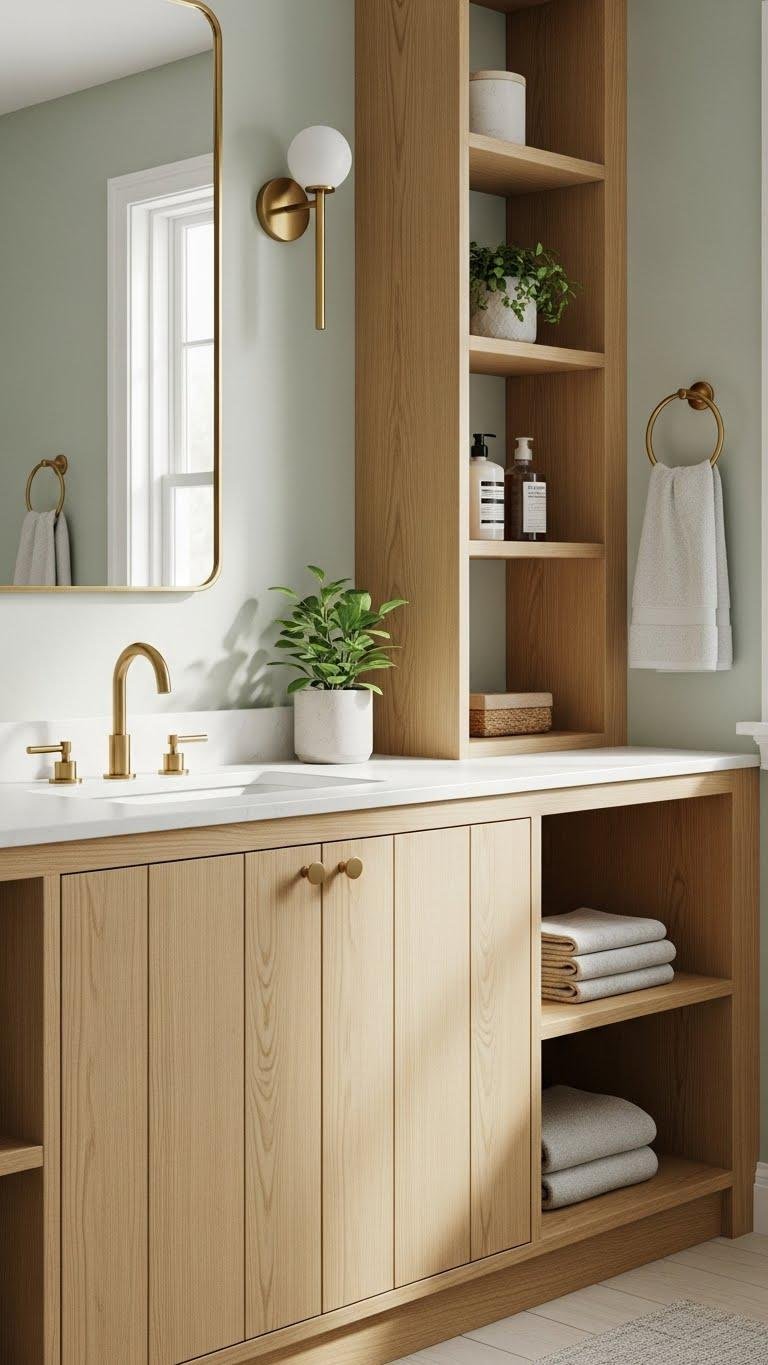 A vanilla oak vanity brings warm, pale wood tones that brighten the room without overwhelming your soft sage walls. Choose straight grain direction for a modern, airy feel and pair hardware in matte brass to add restrained glamour.