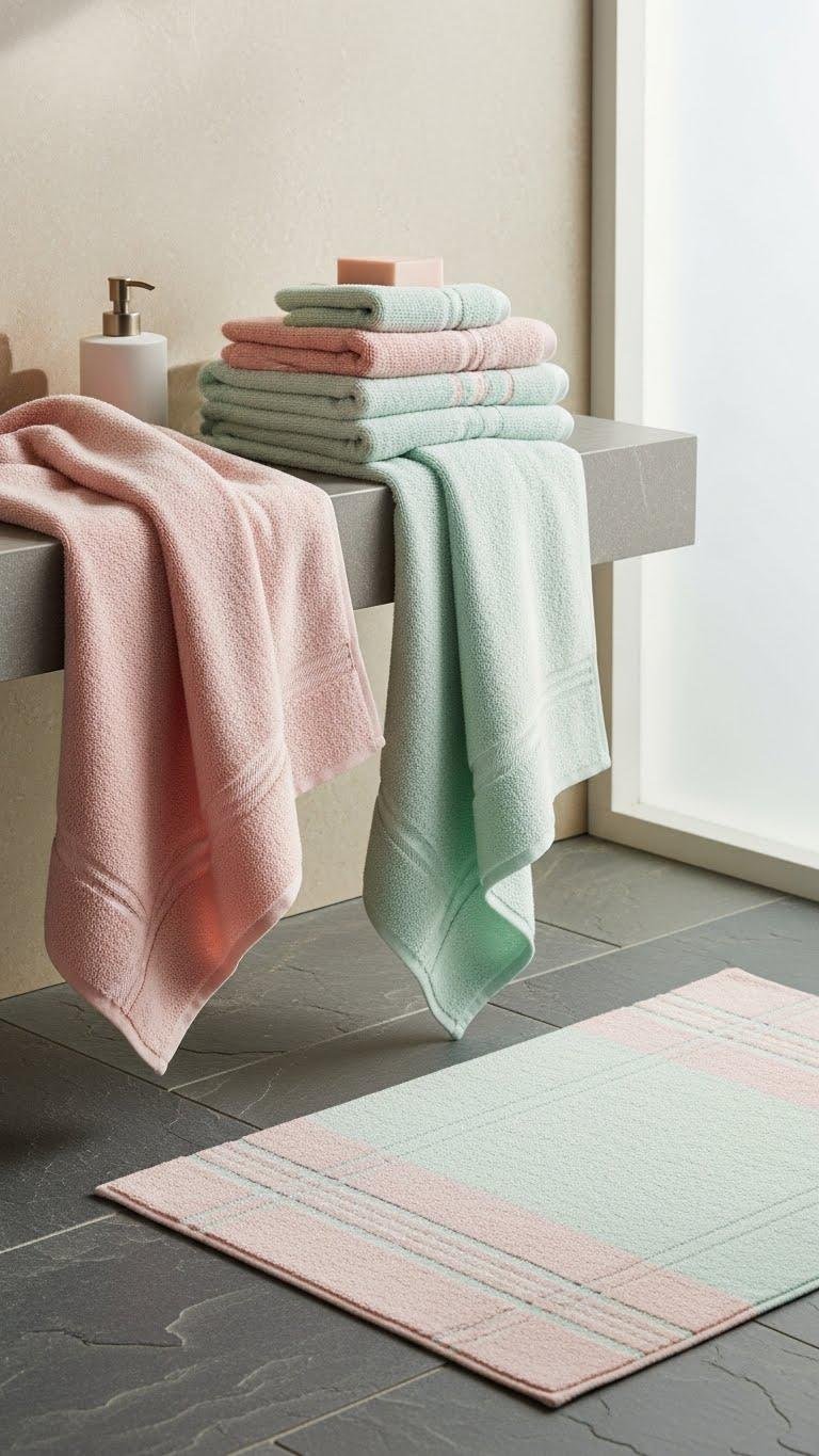 After the niche sets the tone with stone warmth or slate texture, swap in soft pastel towels and bath mats to lighten the feel without reworking finishes. You’ll pick soft blush or mint accents to introduce color calmly; mix solid towels with subtle stripe mats for movement. Choose quick-dry, low-lint fabrics so you stay flexible, fresh, and effortlessly free in your space.