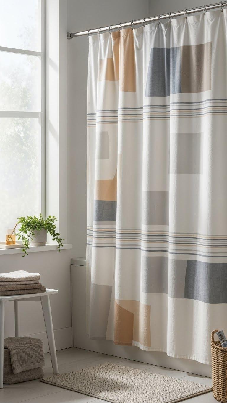 Bring in a simple, subtle patterned shower curtain to add quiet personality without stealing the room’s calm. You’ll pick subtle geometrics or muted stripes to keep lines clean and visuals soothing. Choose breathable fabrics and light dyes so it breathes with the space. Swap seasonally for fresh energy, and let the curtain hint at style while keeping the bathroom airy and easygoing.