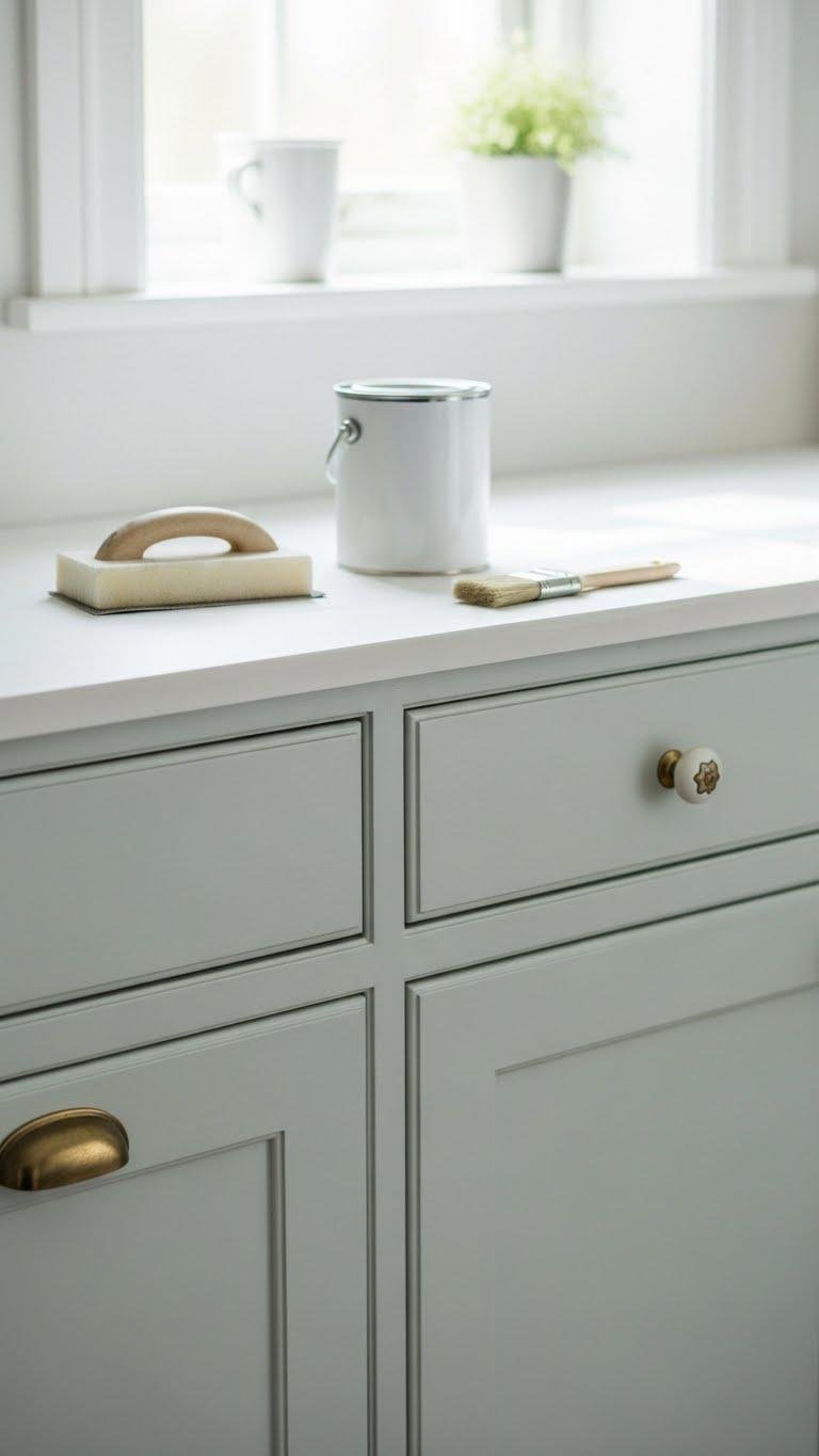 Refresh your cabinets with a pale green‑gray paint to instantly modernize the space while keeping a soft, spring-ready palette. You’ll feel free to update looks fast: sand, prime, paint, then fit vintage hardware for character.