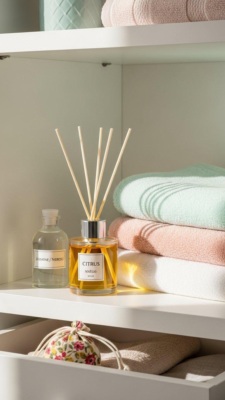 Bring in a light floral or citrus diffuser to lift the room without overpowering it—pick blends with jasmine, neroli, or bergamot for a fresh, springtime lift that pairs well with pastel palettes. You’ll swap heavy sprays for a slim citrus reed diffuser, placing it near towels.