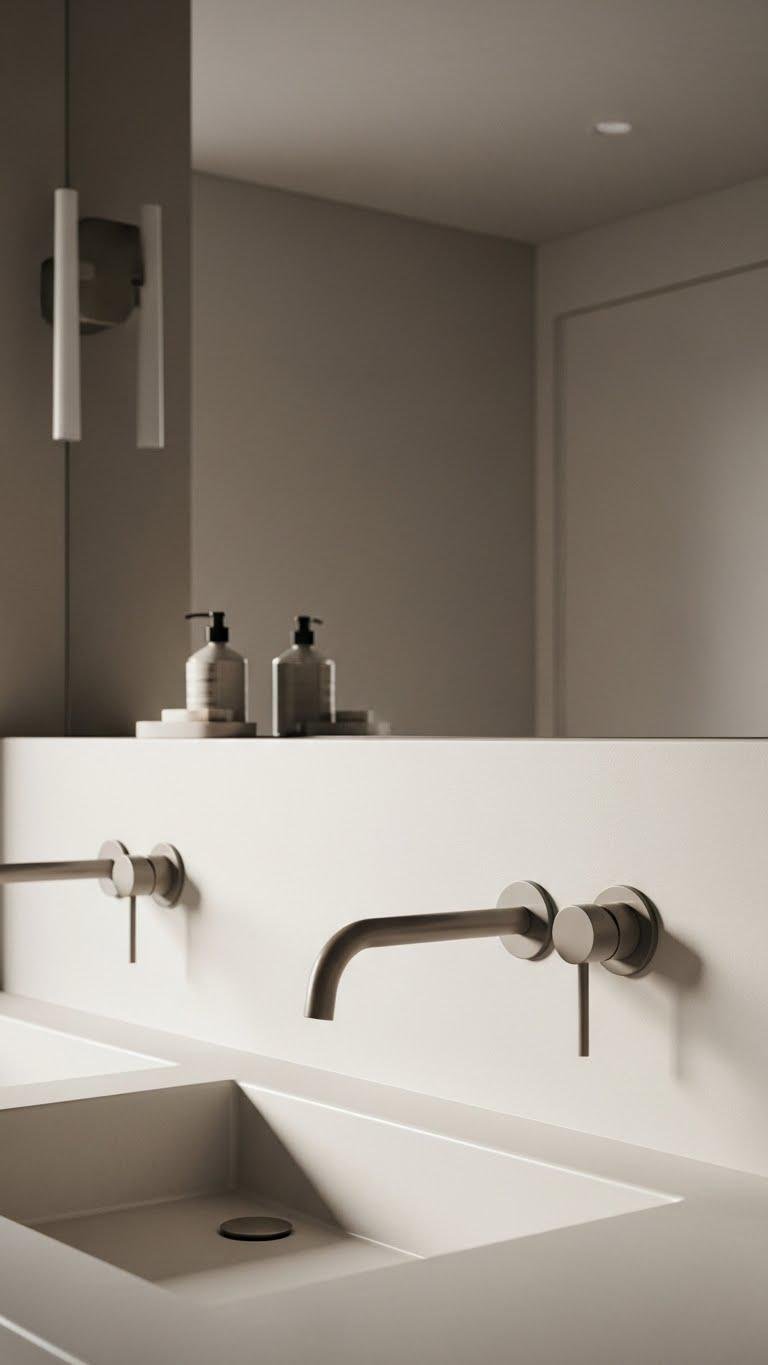 Carrying that soft, unified palette up to the ceiling sets the stage for fixtures to quietly take center stage, so choose faucets that match the room’s calm restraint. You’ll favor matte textures and pared-back faucet silhouettes that read modern and relaxed. Pick easy-clean finishes, slim handles, and wall-clearance spouts so you get fuss-free function and a liberated, uncluttered vibe.