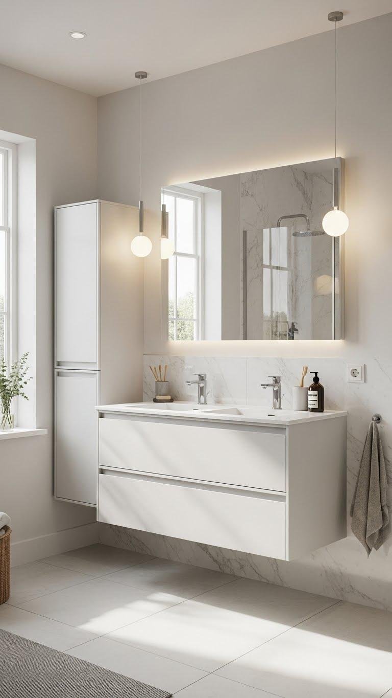 Anchor the room with a white wall-mounted vanity to keep the space feeling airy and streamlined while adding practical storage. You’ll enjoy the liberated floor space and easy cleaning.