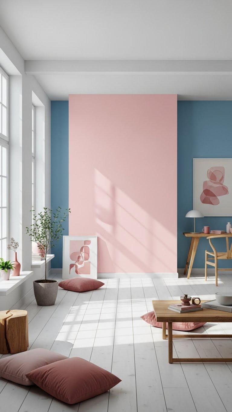 A single barely pink accent wall can warm the room without overpowering its airy blue base — you’ll get a subtle, modern blush that reads fresh and intentional.