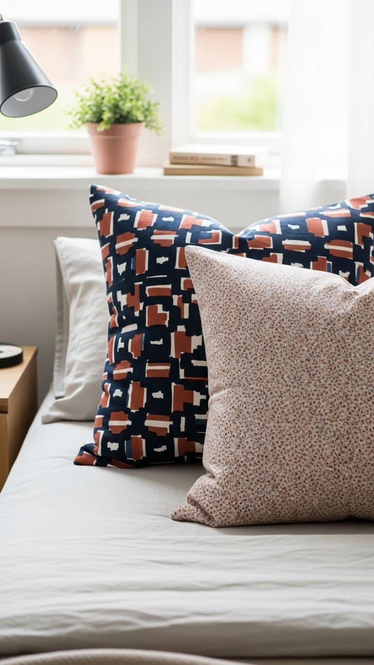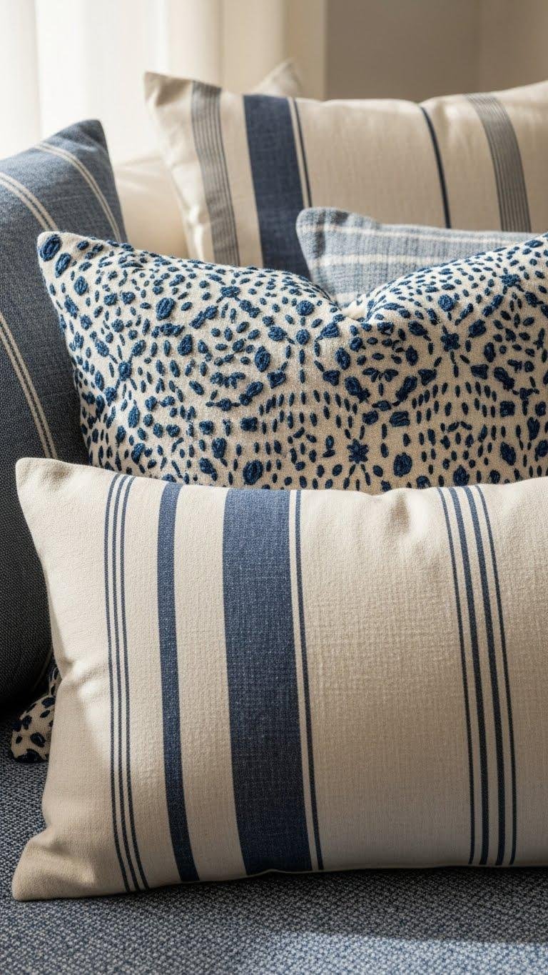 Layer in linen accent pillows with a blue pattern to anchor the bed or sofa with airy, spring-ready texture. You’ll mix nautical stripes and indigo embroidery for contrast: clean linear prints beside hand-stitched motifs. Choose relaxed, slubby linen in varying sizes to create movement. Toss them casually, let the fabrics breathe, and enjoy a liberated, coastal-infused calm that still feels modern.
