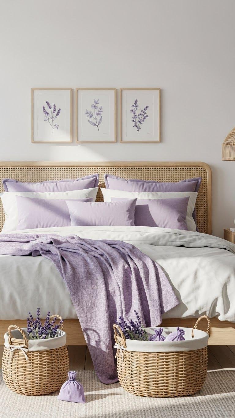 Layer pale purple throw pillows and a lightweight blanket, and hang minimalist botanical artwork above the bed. You’ll create an airy, liberated retreat that feels intentional and calm.