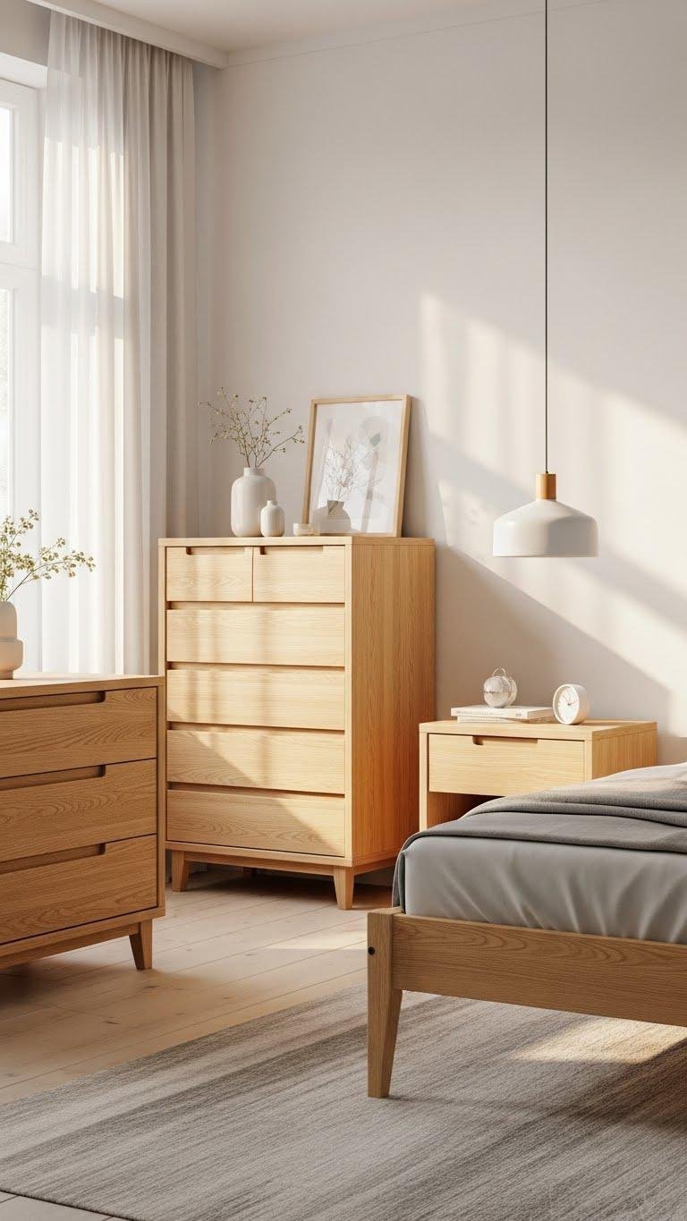 A light-colored wood dresser, nightstand, or bed frame can instantly warm a spring bedroom while keeping the look airy and modern; choose pieces with clean lines and subtle grain to keep the room feeling fresh and uncluttered.