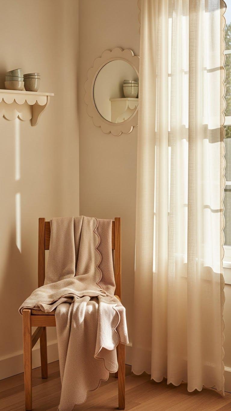 Bring in scalloped trim to add instant charm and a touch of whimsy without overdoing it. You’ll layer a scalloped shelf edge, mirror frame or curtain hem to wink at vintage playfulness while keeping lines clean. Pair with a trimmed throw tossed casually on a chair for movement and texture. These small details let you personaliz e freely, softening the room without clutter.