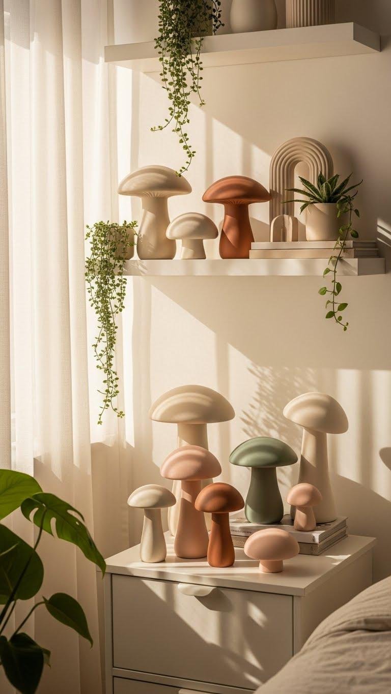 Let mushroom motifs punctuate shelves, nightstands and wall art; they read playful, modern and liberated.