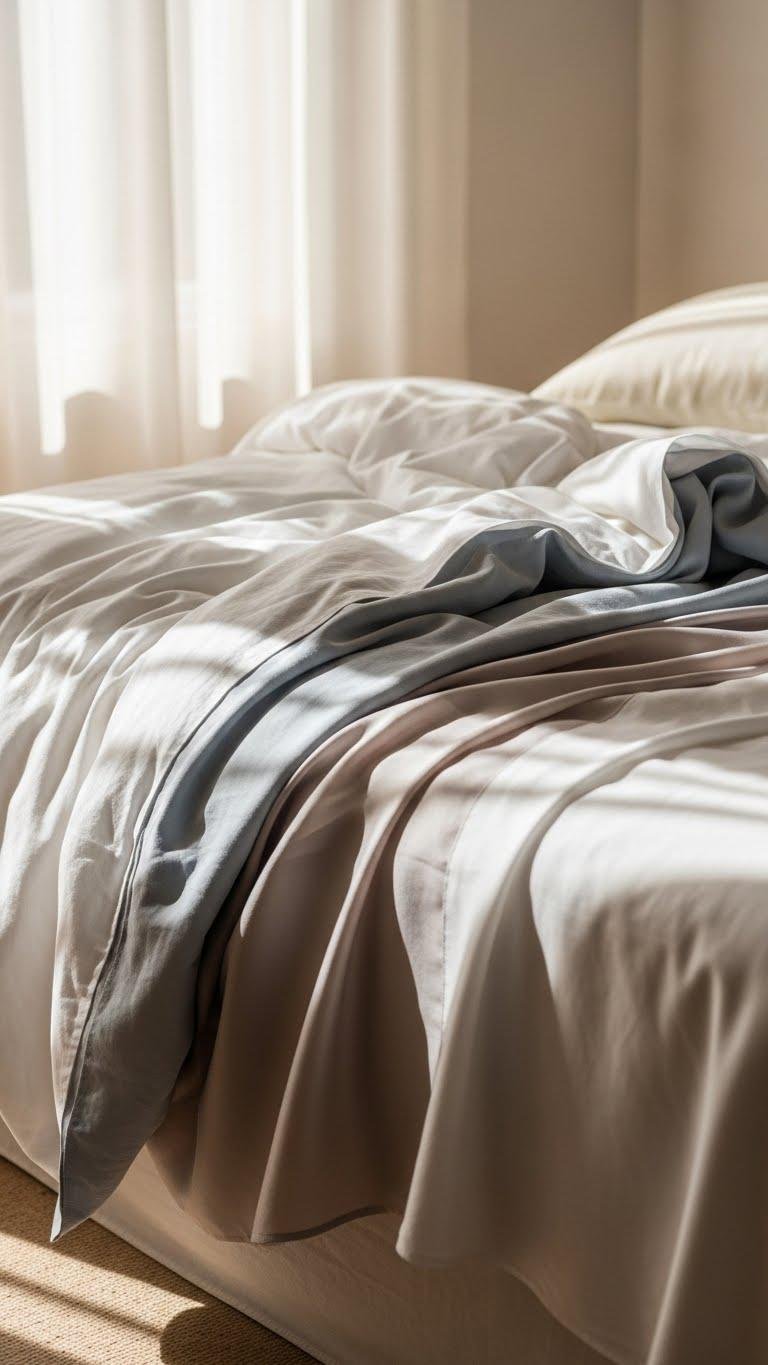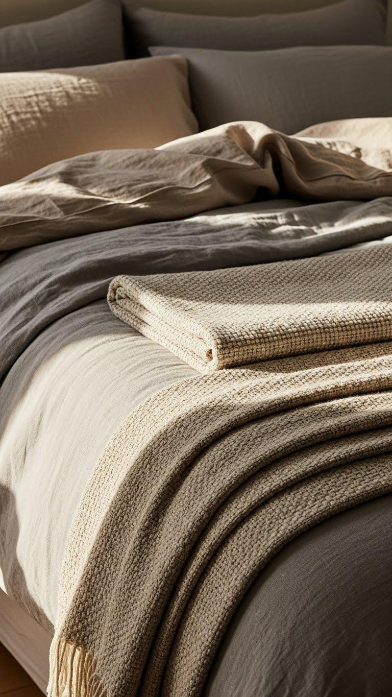 Pull on lightweight linen sheets, then layer with a slightly heavier linen duvet and a couple of textured throws to create depth without weight. You’ll embrace breathable textures that keep nights cool and mornings easy. Let relaxed wrinkles show — they read lived-in, free. Stick to a muted palette, mix subtle weaves, and arrange casually so the bed feels airy, not contrived.