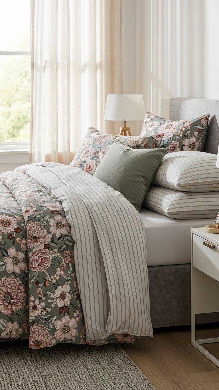 Don’t shy away from mixing florals with pinstripes—pairing a soft botanical print with slim, neutral stripes creates a fresh, modern contrast that keeps the room feeling composed, not busy.